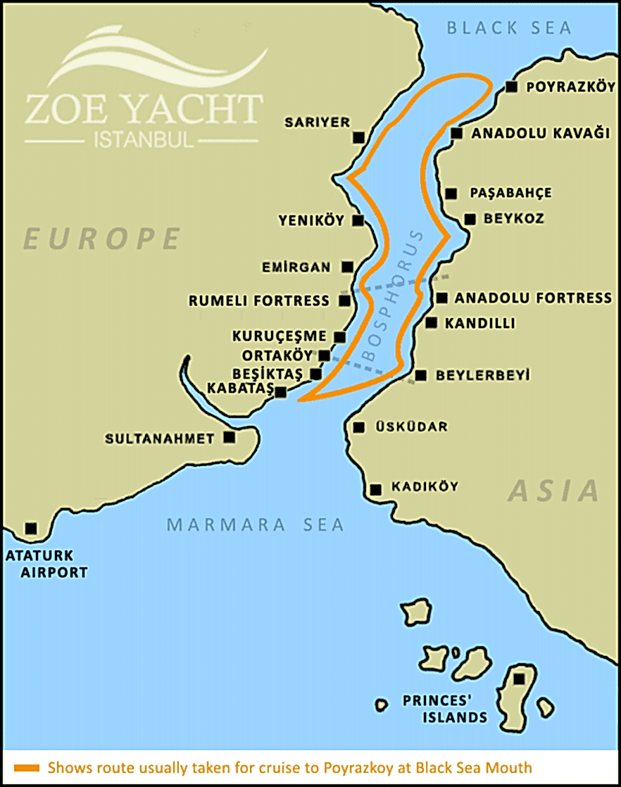 Click the map to enlarge and view the route usually taken for this Bosphorus cruise to Black Sea as far as Poyrazkoy: